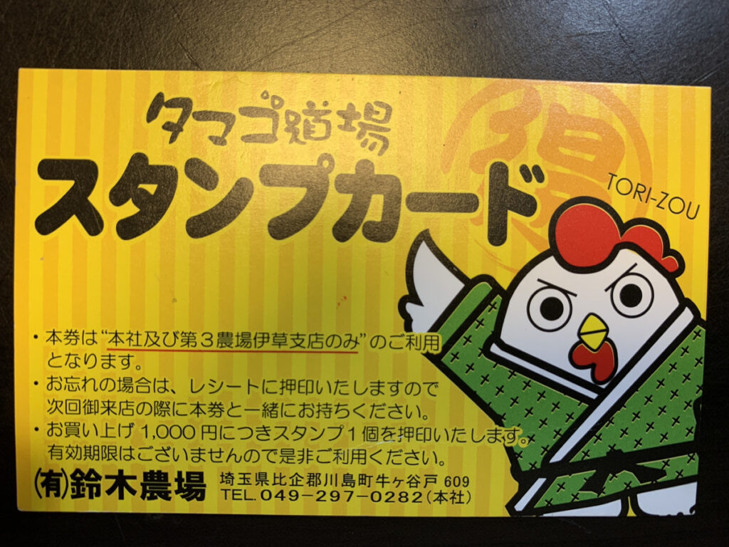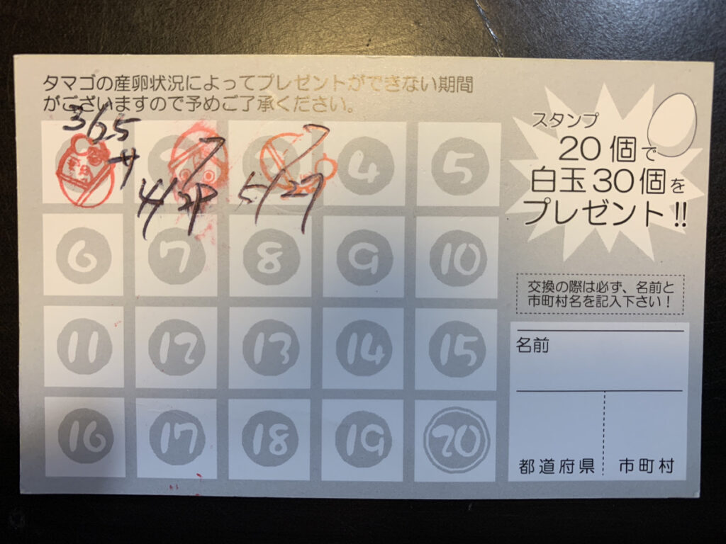 鈴木農場ではスタンプカードサービスもやっています。鈴木農場の本社、もしくは第3農場の店舗での購入が条件。鈴木農場の卵をはじめとした商品購入1,000円につきスタンプ1個です。スタンプ20個で白玉30個がもらえます。卵の価格が高騰している中、卵プレゼントはうれしいですね。卵の直売所でスタンプカードサービスを行っている直売所は珍しいのではないでしょうか?スタンプ20個、チャレンジしてみてはいかがでしょうか?