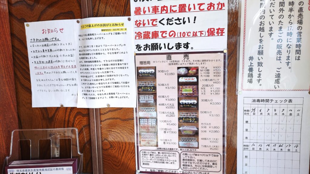 井上養鶏場では対面販売以外にも自動販売機で購入することも出来ます。自動販売機であっても対面販売と同じように新鮮な卵を購入することができます。もちろん値段も同じです。自動販売機で買うメリットは人に会わずに非接触で買うことが出来ます。また、ゆっくりと品物を選ぶこともできるので、卵直売所での卵購入の初心者の方には自動販売機での購入の方が気兼ねしないかもしれませんね。