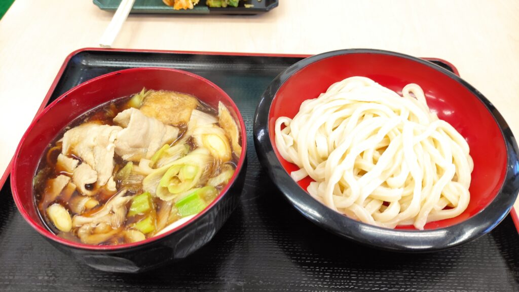 あぐれっしゅ川越には武州めんという武蔵野うどんのお店が併設されています。武蔵野うどんはモチモチしていてコシの強い太麺が特徴。そして、武州めんの一番人気はもり肉汁うどん。麺は冷と温が選べますが、基本は冷。熱々の肉汁に良く締まった太麺を入れて食べるのがおいしい。つけ汁には豚バラ肉以外に長ネギと刻んだ油揚げが入っています。うどんに甘じょっぱいつけ汁をたっぷりと付けてワシワシ食べるのが武蔵野うどんのスタイル。武州めんの肉汁うどんはこれぞ武蔵野うどんといった王道の味です。川越には武蔵野うどんの名店が多くありますが、負けていません。今回は肉汁うどんの小とセリのかき揚げを注文。これで十分にお腹いっぱいです。