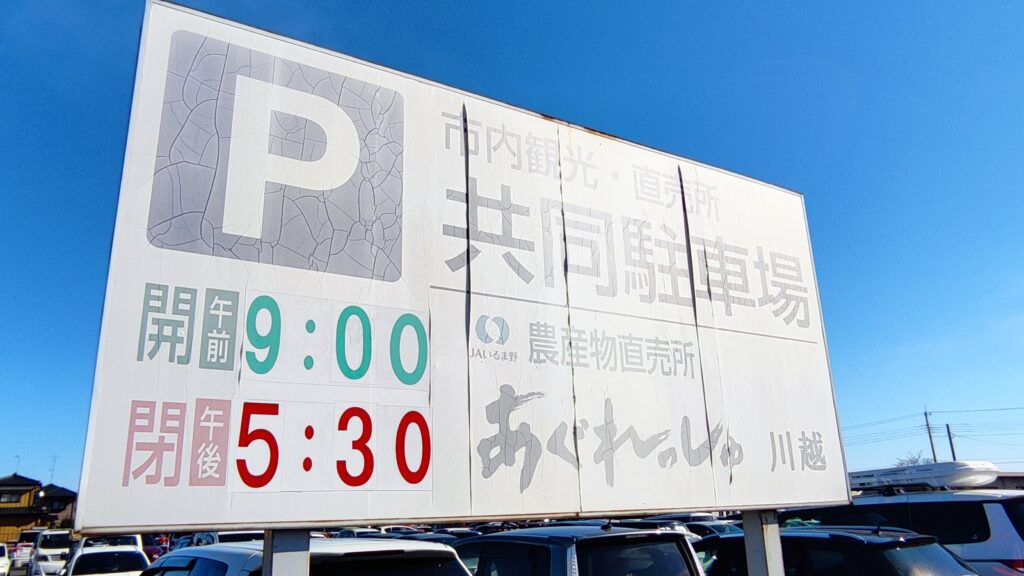 あぐれっしゅ川越は駐車場が川越観光の無料駐車場となっています。一部直売所専用の駐車場もありますが、ほとんどが無料で川越観光の駐車場として利用することが可能。あぐれっしゅ川越から川越観光の人気スポット、時の鐘まで歩いて約15分。川越観光の中心地までの間に川越城址や川越市立博物館などの立ち寄りたい観光スポットもあり、あぐれっしゅ川越に車を停めて散歩しながら川越観光を楽しむのも良いでしょう。イーグルバスの小江戸巡回バスがあぐれっしゅ川越の前に停まるのでバスを利用するのもお勧めですよ。